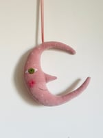 Soft, starry pink cotton velvet hanging sickle moon with hand stitched detail.
