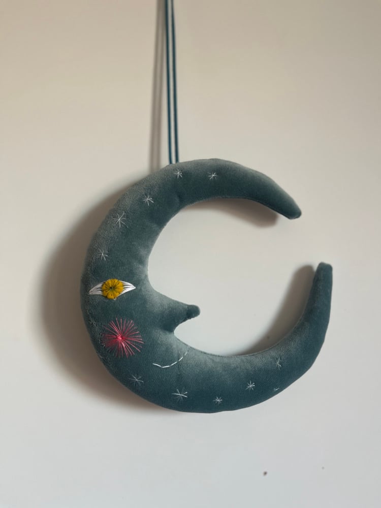 Soft blue cotton velvet hanging new moon with hand stitched detail.