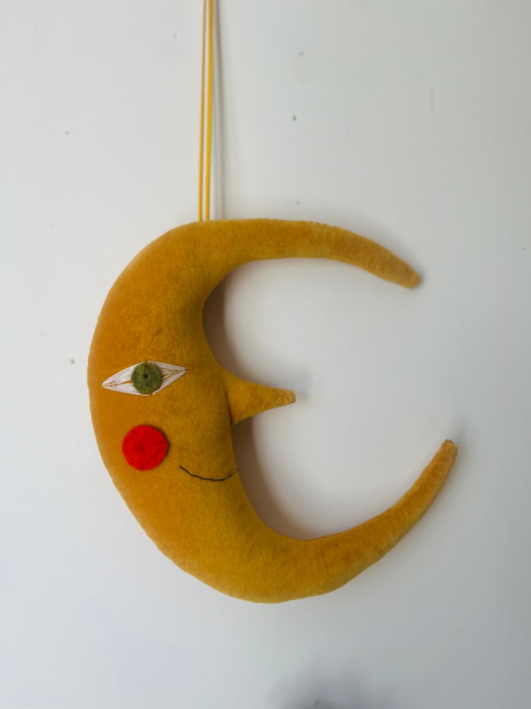 Pale gold vintage velvet hanging moon, hand stitched with wool felt detail.