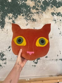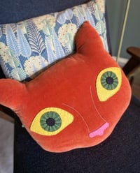 Ginger soft cotton velvet cat cushion with hand stitched appliqué detail in wool felt.