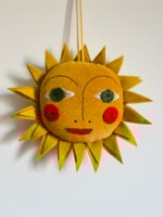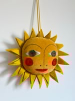 Each sun is hand sewn and embroidered with appliqué wool felt detail. With faux suede cord to hang on your wall or window.