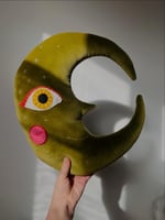 Limited edition green velvet crescent moon cushion in lush vintage cotton velvet with hand stitched wool felt appliqué detail.